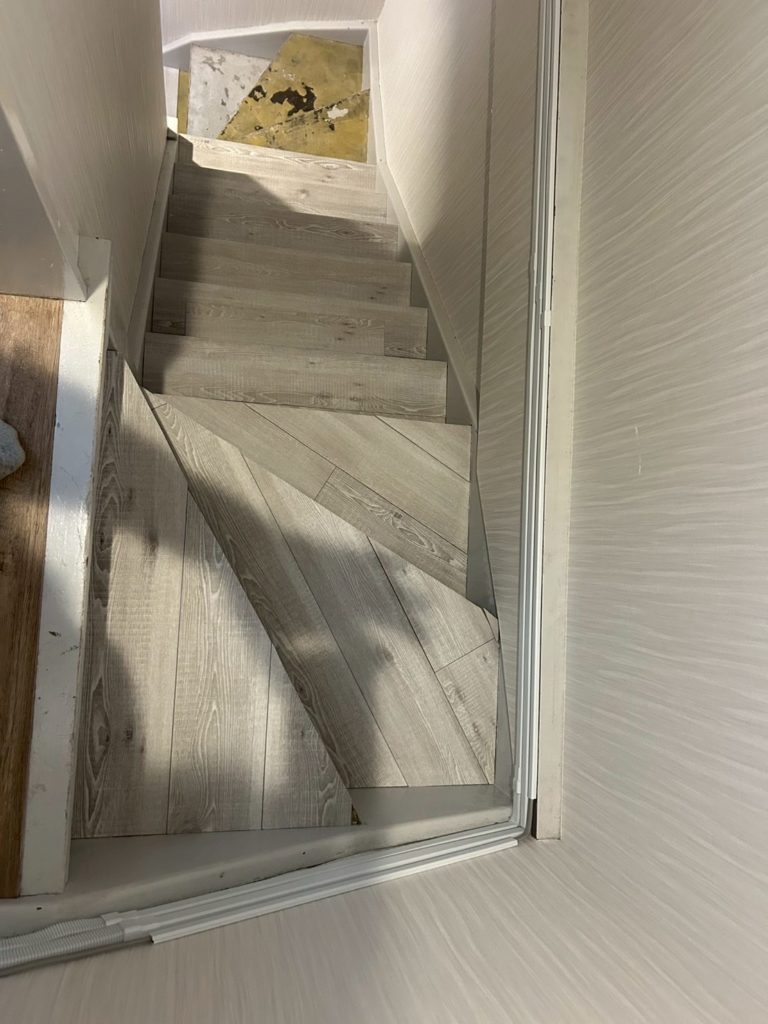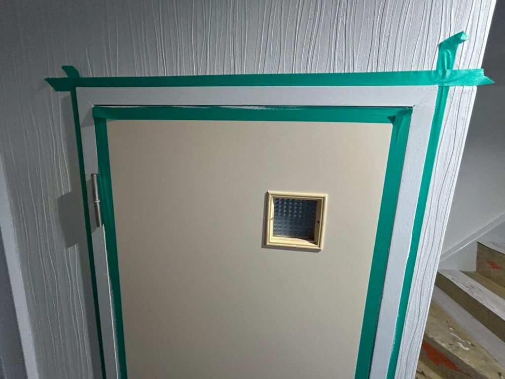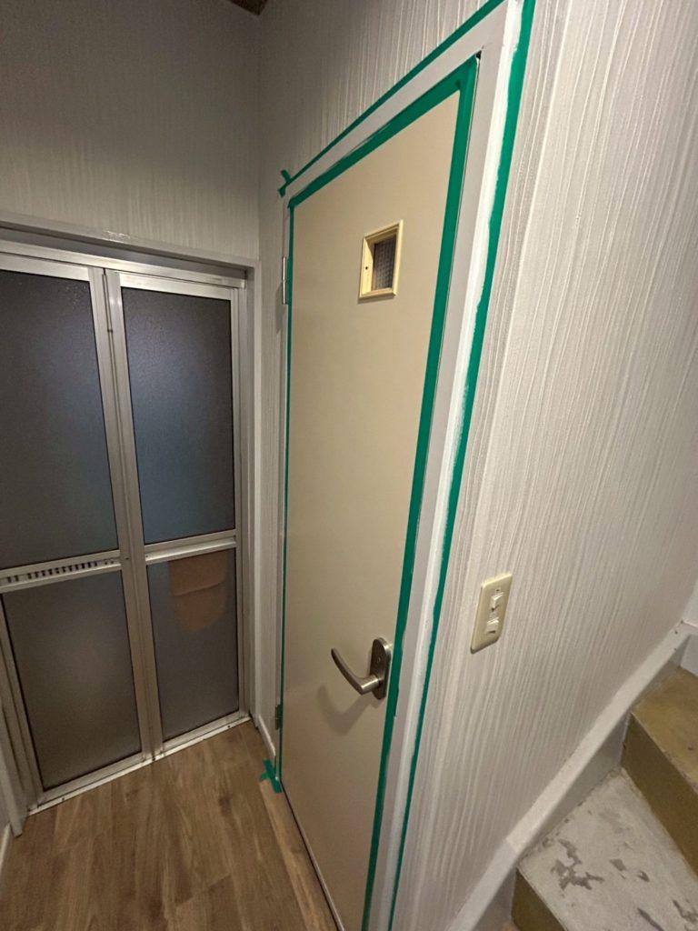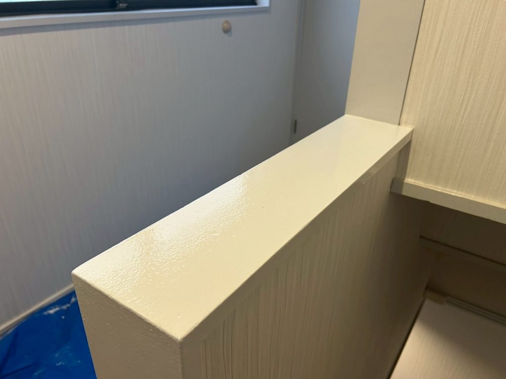 その他にも、塗装作業と階段の改修作業が進行中です。階段は非段差設計ではなく、出隅にカバーが貼られていました。