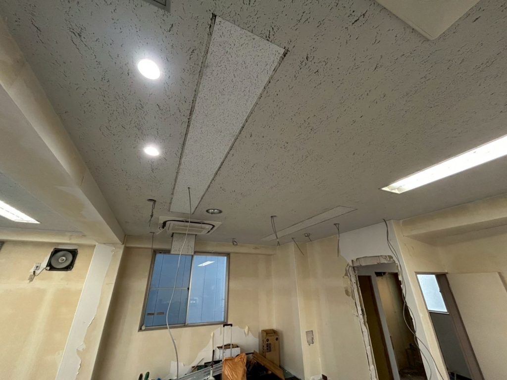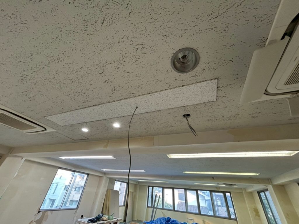 作業は2階から進め、ミーティングルーム・トイレの増設や既存トイレの改修、天井の塗装、壁クロスの張替、タイルカーペットの貼替を行ってまいります。