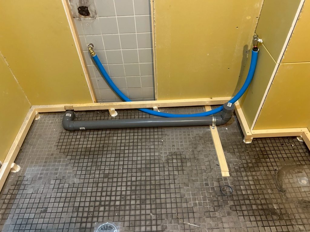 会社Nさま、便利なミニキッチン設置でより快適な環境を。 ブログ ミニキッチン設置, 内装改修工事, 設備工事 1階部分のトイレとキッチンの改修を行っています。二重床を設置する前に、給排水の切り回しとミニキッチンの設置が行われました。 壁ボードと床の設置は明日完了予定です。 引き続き仕上げ作業に取り掛かります。