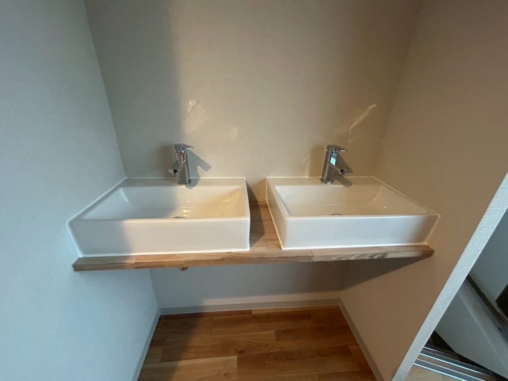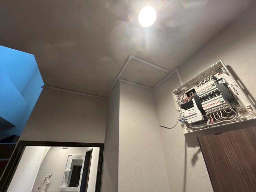 2階では洗面器の設置と、誘導灯の追加配線作業が完了しました。