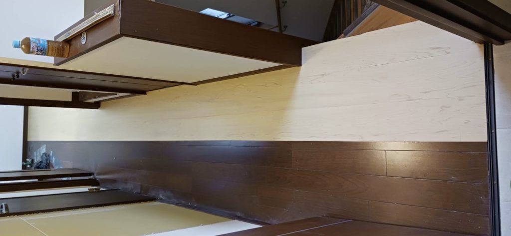 1階と3階部分フロアタイル貼が始まりました。現在、建物の旅館施設リニューアル工事が進行中です。