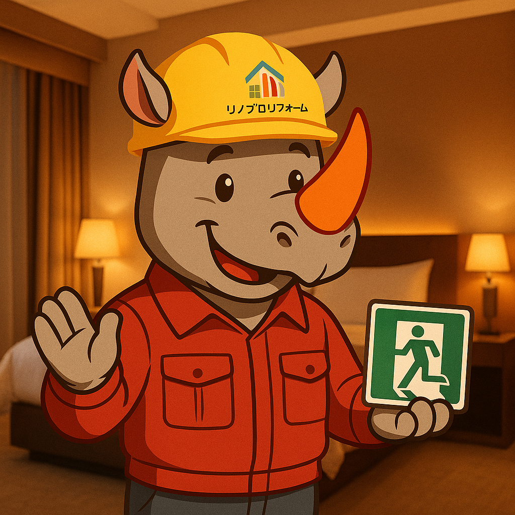 旅館業用途では「居室から2方向への避難」が求められることが多く、