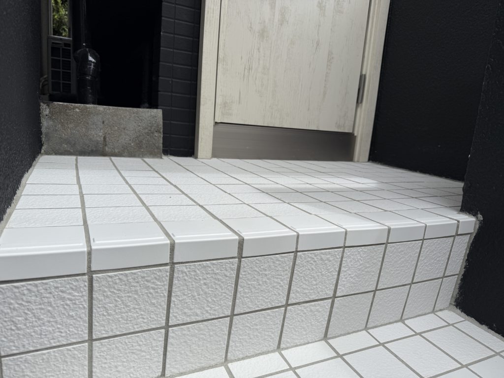 屋根外壁塗装を行い、玄関ドアカバー工法、タイル重ね張りを行いました。