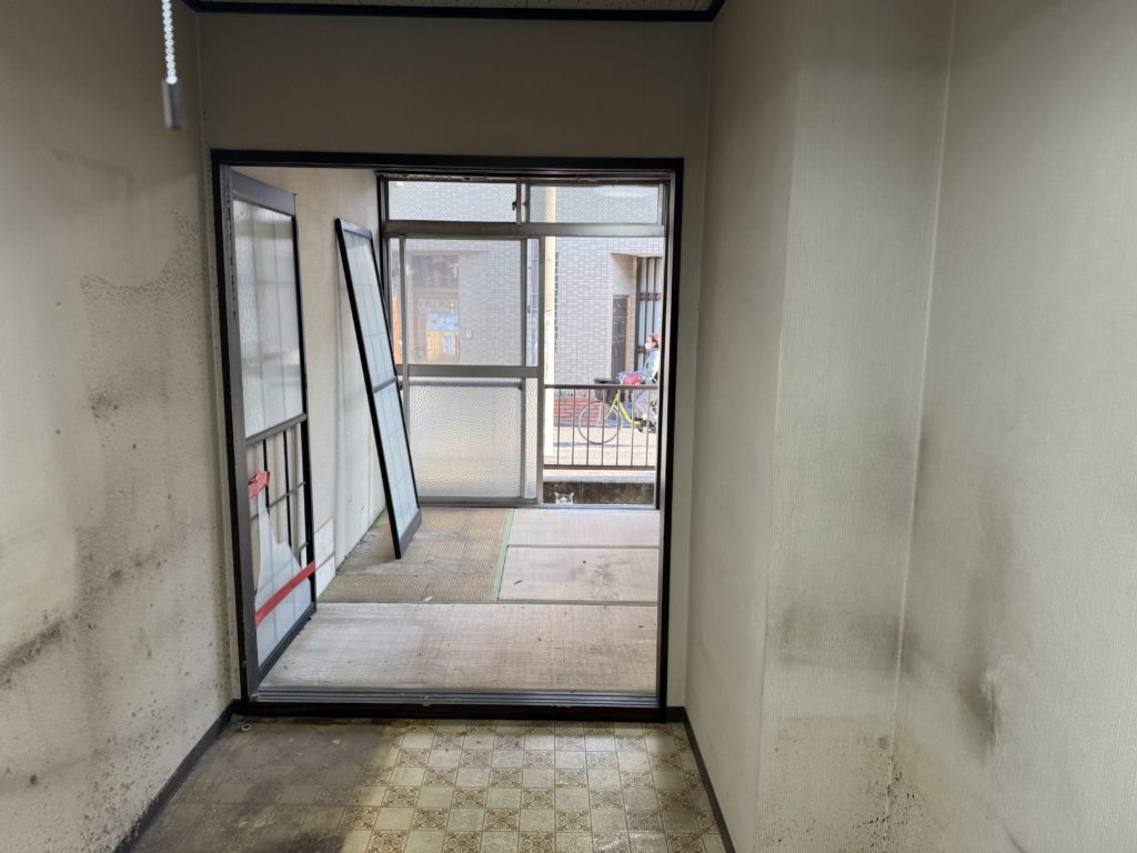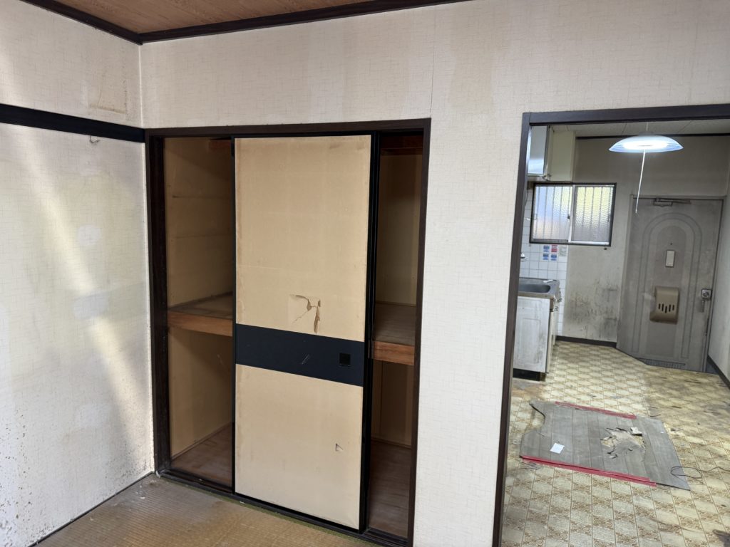 既存設備として設置されていたバランス釜・浴槽・キッチン・換気扇・吊戸棚・トイレ・畳・押入れ・各種建具をすべて解体・撤去し、室内を一度リセットした状態から工事をスタート。給湯設備については、利便性と安全性を考慮し、外部に給湯器を新設いたしました。