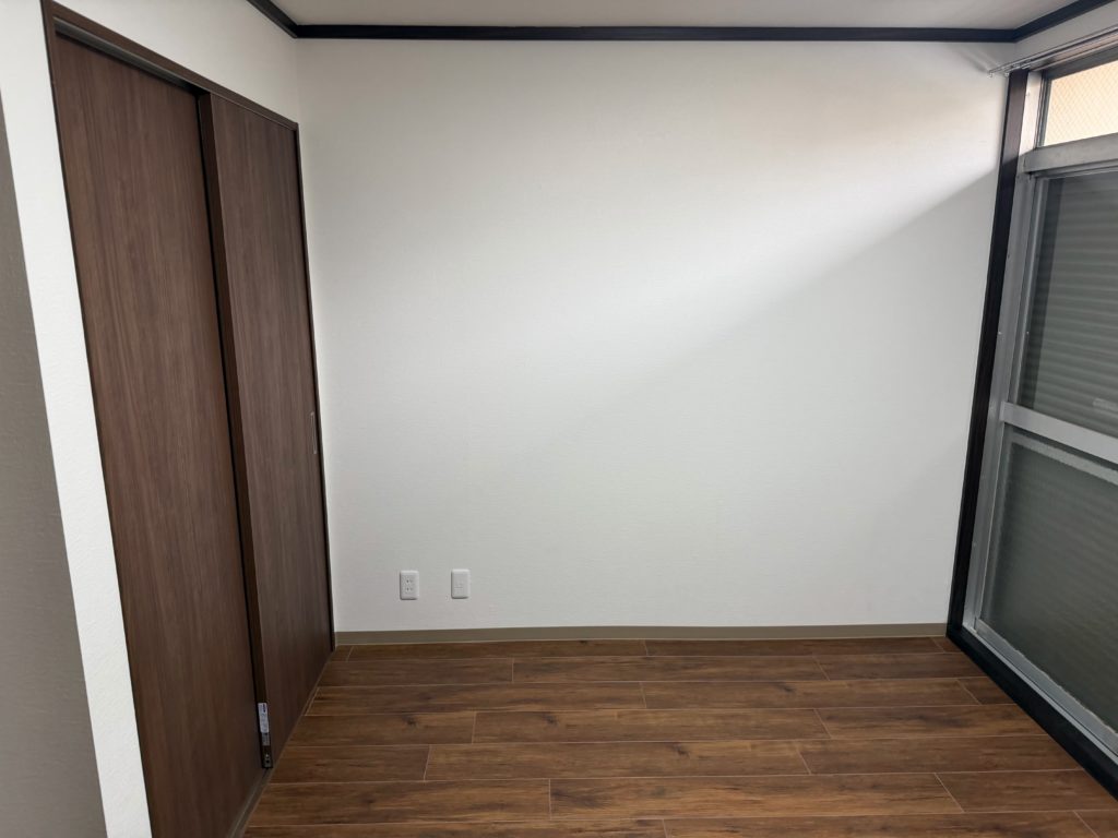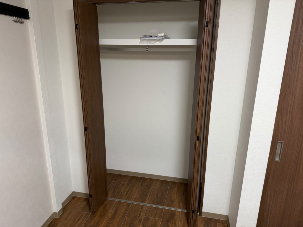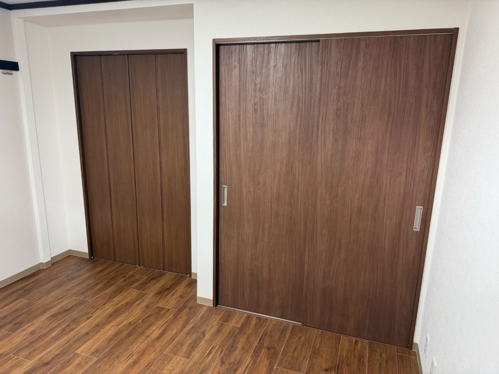 和室部分については、従来の畳から板張り+タイル仕上げへ変更し、清潔感と耐久性を兼ね備えた仕様へリニューアル。さらに押入れの一部を有効活用し、クローゼットへと変更。扉・枕棚・ハンガーパイプを新設し、収納力と機能性を向上させました。
